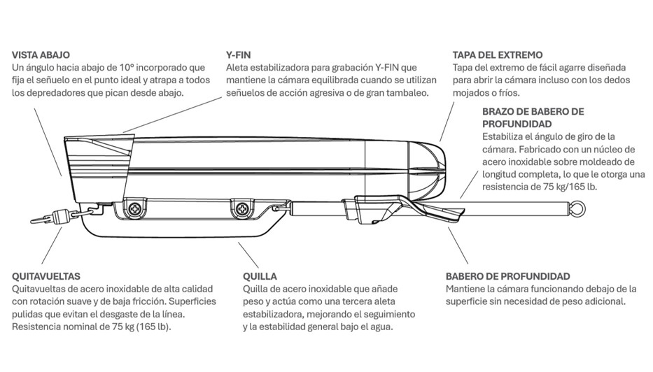 Vista fija de 10° hacia abajo: encuadre perfecto del señuelo y la picada.
